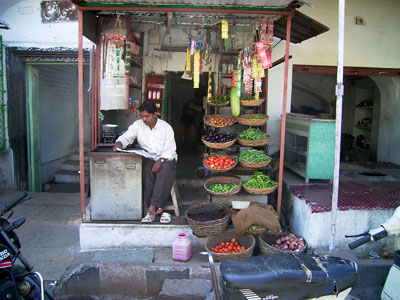 | 生地店。ハイデラバードは、ムスリムのカーペット敷きの影響からか、床に座るスタイルの店も多かった | ちょっとからかい気味に話しかけてきた少年 | |