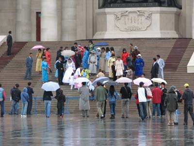 | スフバートル広場のチンギスハーン像(上の写真)の階段で結婚式の写真を撮る人たち | 乗馬の途中立ち寄ったゲルで | |