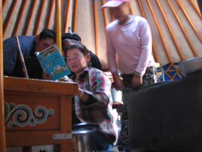 | 指さし会話帳を見せたらみんな興味津々 | フブスグル湖の宿で英語ができる数少ない宿の家族。調理も担当。美人だったが写真写り悪く撮ってしまい申し訳ない。 | |