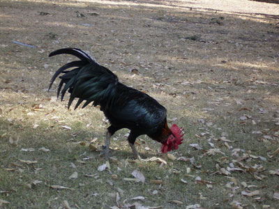 | やたら飛び回って元気な雄鳥 | 昼間はグテーっとお休みタイ犬 |