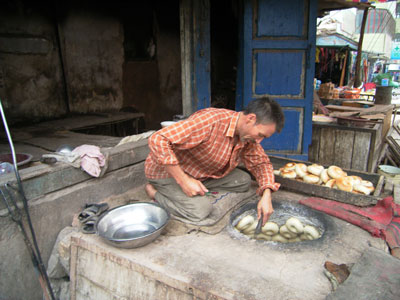 | スイカ売り。一切れ5角で食べさせてくれます。甘くて美味しい | ナン屋。この地方のナンはピザ生地状で、タマネギが入っているももあります。 | |